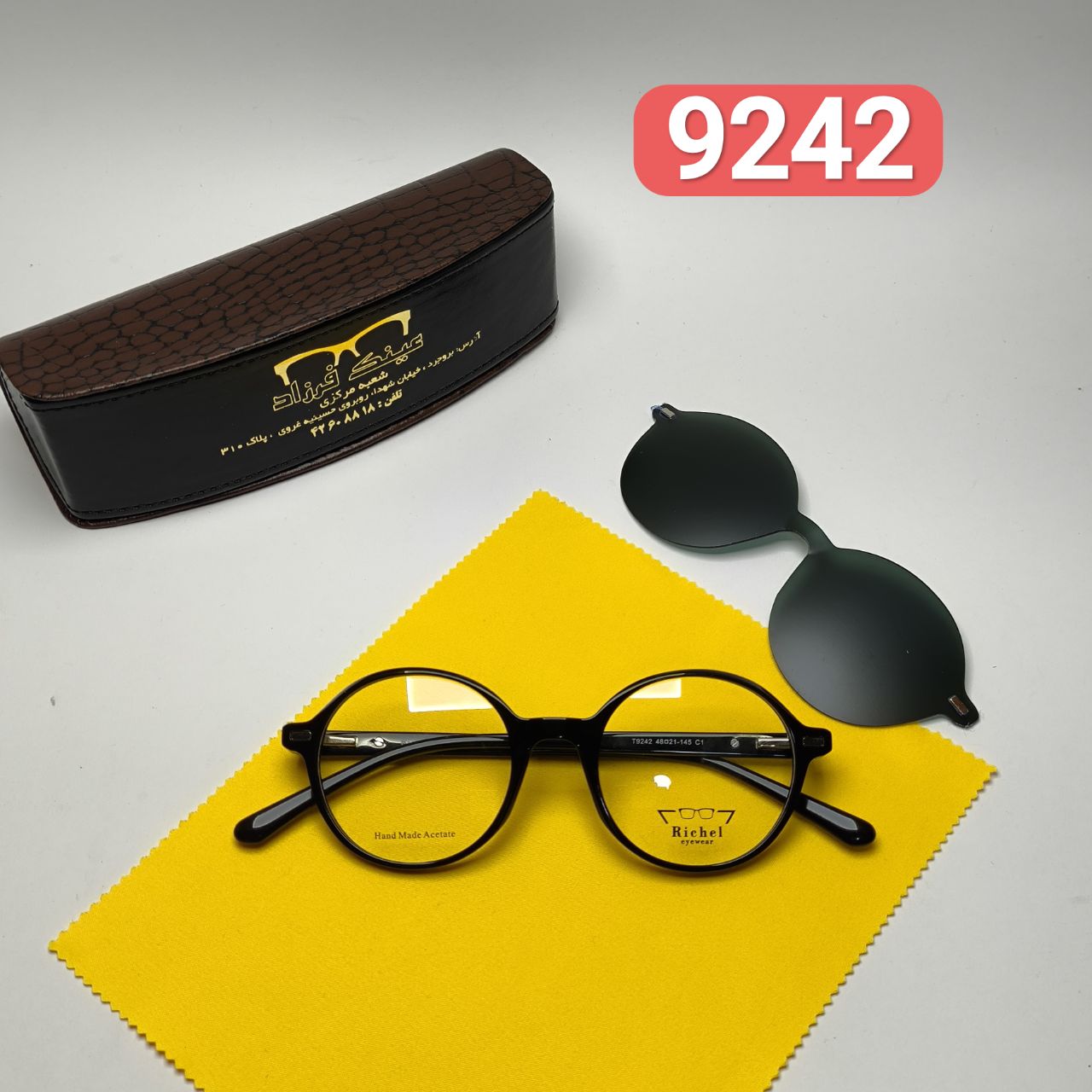 عینک طبی کاور دار ریچل Richel مدل 9242 اورجینال دسته سیم کائوچو پلاریزه اسیتیت به همراه پک هدیه